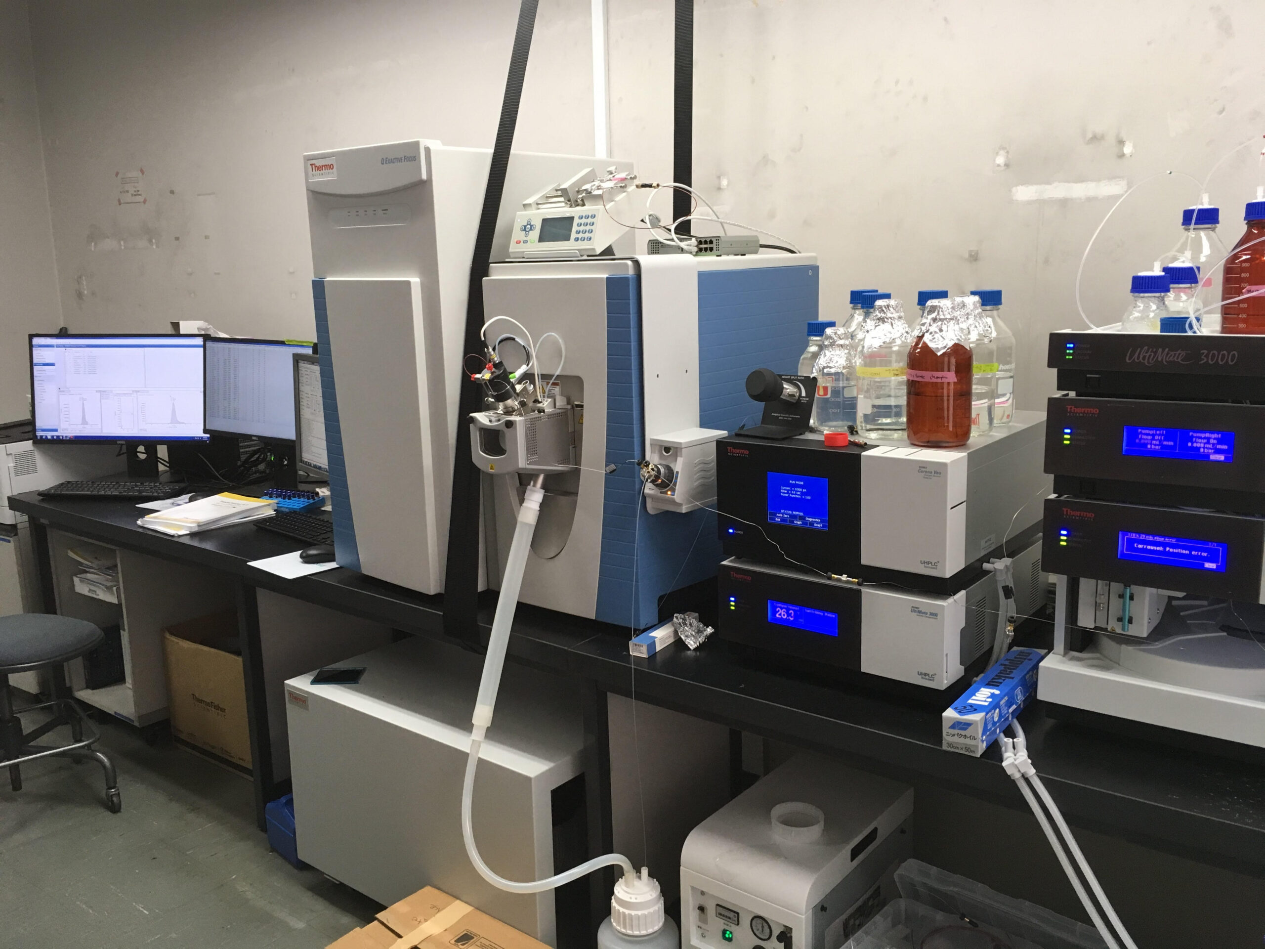 (3) 水利用を考慮した水環境中の有機物管理生活や産業から排出される多種多様な有機物は水処理を経て、天然の有機物とともに水環境に存在します。それらの一部は水利用を行う際に有害性が懸念されるほか、消毒副生成物を生成し、細菌再増殖の基質となり、水処理における障害の要因ともなっています。我々は、高分解能質量分析を用いて有機物を分子種レベルで把握することにより、未知の成分をトップダウンで追跡して各種課題の解決方法を示す研究に取り組んでいます。 写真:有機物を分子種レベルで把握するための高分解能質量分析装置 |