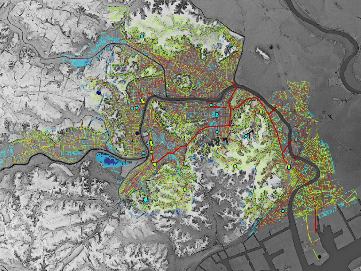 (1) Advancement of Urban Flood Risk ManagementAs the frequency of torrential rainfall increases, development of smart urban flood control is required. Therefore, we have been developing next-generation urban flood prediction systems that utilize advanced technologies such as high-resolution radar rainfall observation and real-time sensing of water levels in drainage pipes using manhole IoT. We have conducted research on maximized utilization of inundation countermeasure facilities based on highly accurate flood prediction information, evacuation behavior guidance and inundation prevention plans for damage reduction. Image: A new urban inundation model that comprehensively analyzes water levels in river and drainage systems in the Tsurumi River lowland |