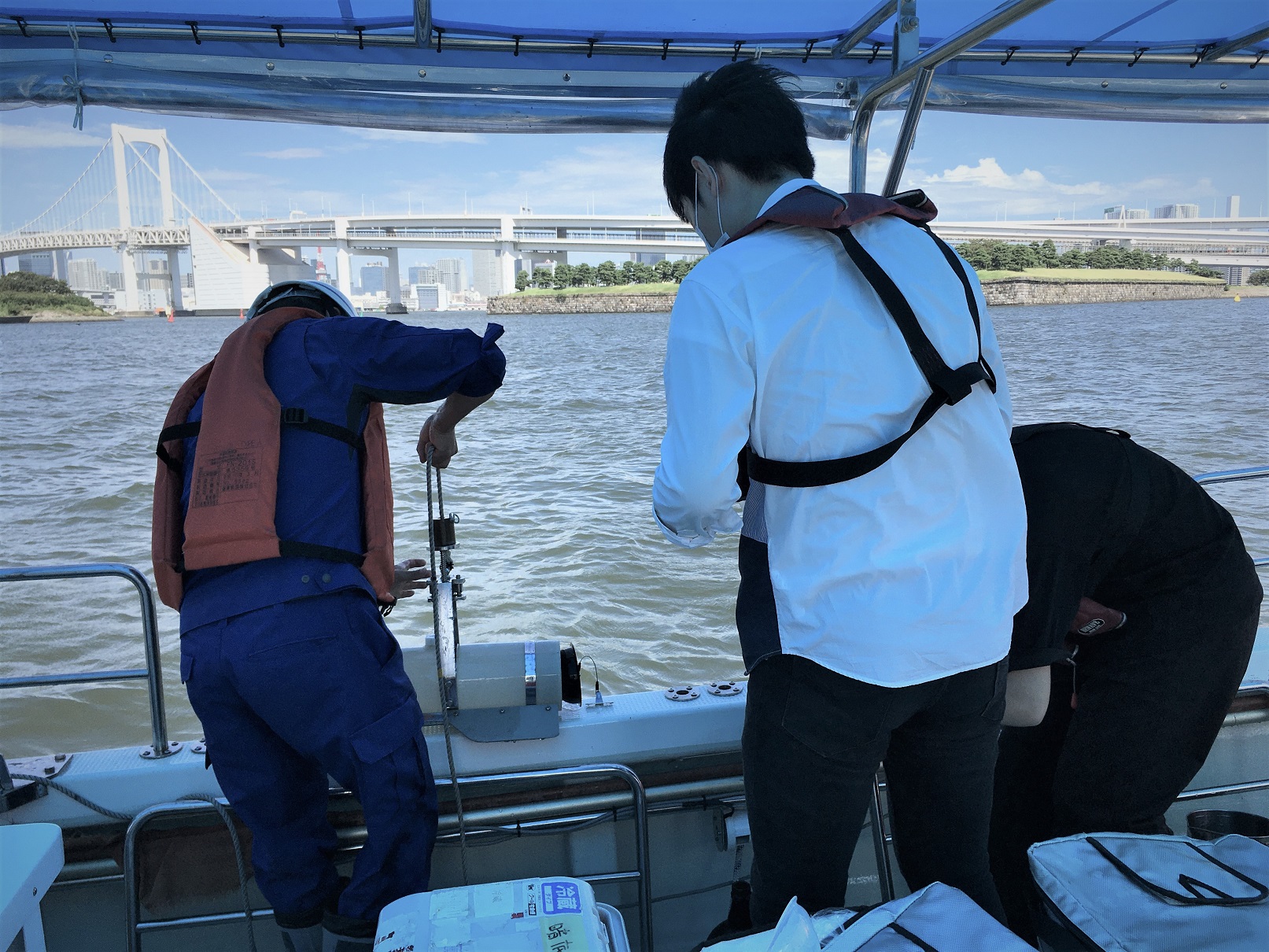 (2) Elucidation of Wet Weather Pollution in Urban Coastal AreasWet weather pollution loads include non-point source pollution load derived from road traffic and combined sewer overflows. It is required to evaluate not only pollution by micro-pollutants such as heavy metals and polycyclic aromatic hydrocarbons, but also fecal pollution in the receiving water. Therefore, by elucidating the pollution mechanism using a model and evaluating health risks in the waterfront areas, we have conducted research aimed at predicting pollution derived from combined sewer overflows during wet weather and examining effective countermeasures. Photo: Water sampling in the Tokyo Harbor coastal area after rainfall event |