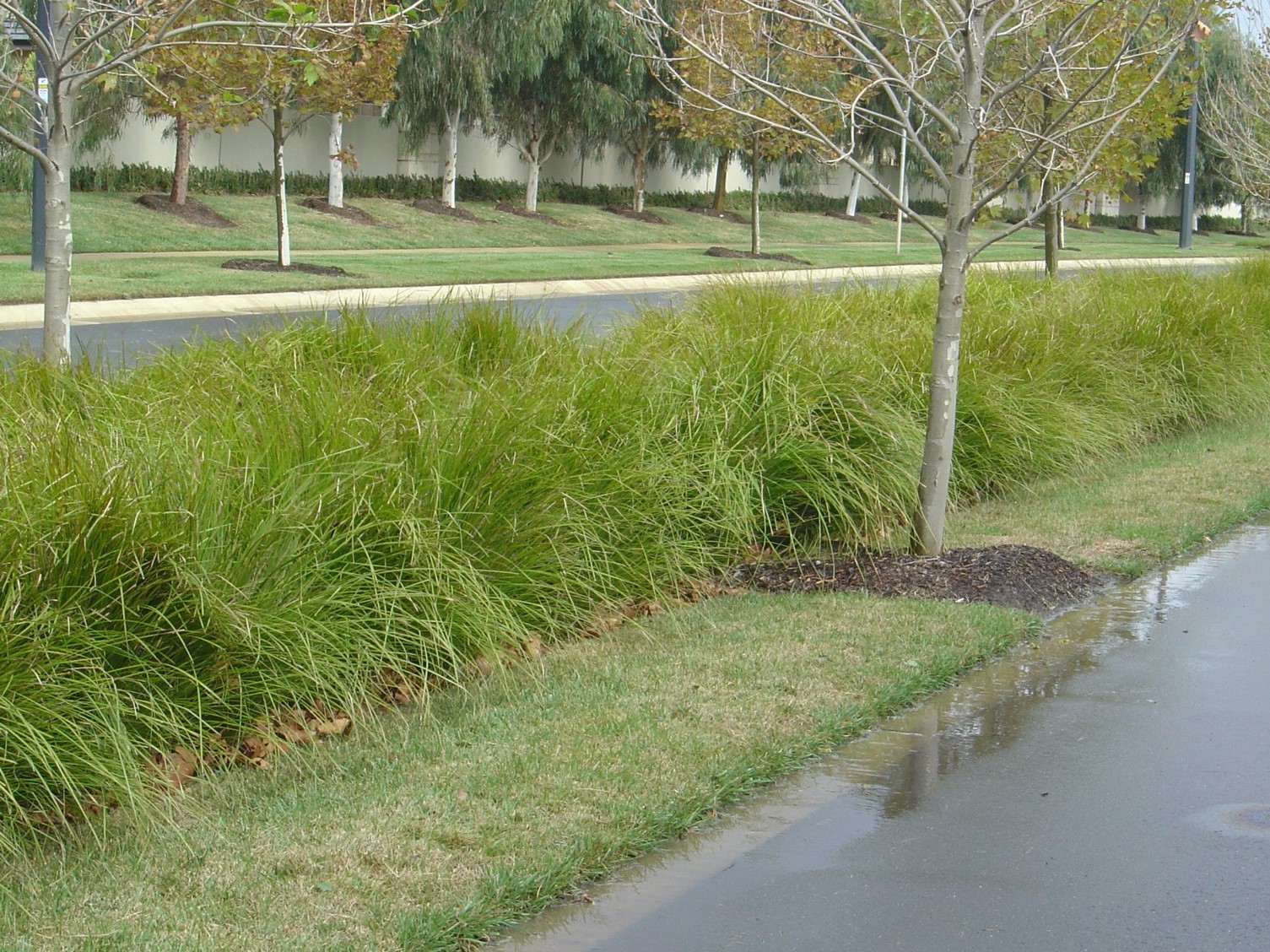 (3) グリーンインフラなどの雨水流出抑制対策の評価都市雨水管理において、河川改修や下水道整備とともに雨水流出を抑制する浸透・貯留施設を設置する流域対策が重要となっています。緑地空間を生かした流出抑制施設であるグリーンインフラは、魅力ある居住空間の創出、雨水をゆっくり流すことによる浸水対策の強化、地下水のかん養、市街地排水中の汚染物質の除去など、多面的な機能を有しています。そこで、流域水循環モデルを構築してその機能を定量的に評価する研究をしています。 写真:流出抑制効果を持つグリーンインフラの事例 |