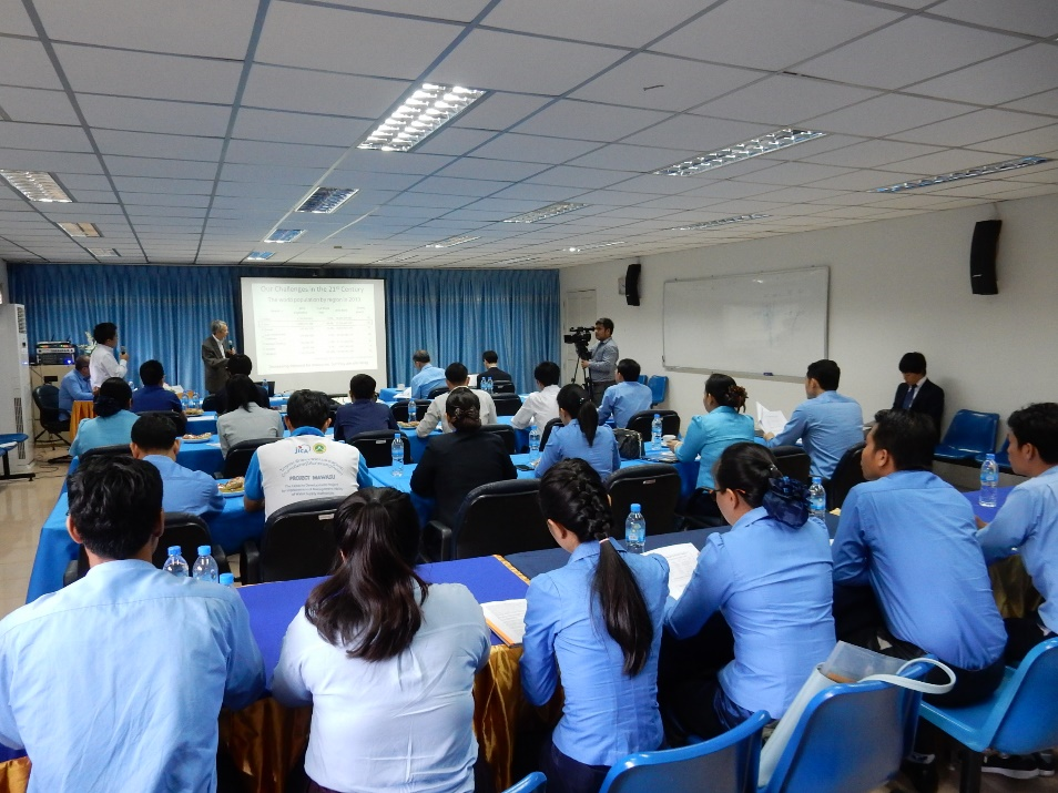 (2) 水道分野中核人材育成プログラム都市人口の増加と経済開発により、アジア諸都市の水需要が急増しています。これらの都市では、水需要が供給能力を上回り、水不足が深刻化しています。このような水不足を解消するためには、水道事業に関する法制度の整備とともに、水道事業者における人材の育成が急務です。本プログラムでは、アジア開発途上国の水道技術者を大学院修士課程に受入れ、現地の課題解決を通じた人材の育成を行っています。 写真:ラオス首都ヴィエンチャンで開催した水道事業セミナー |