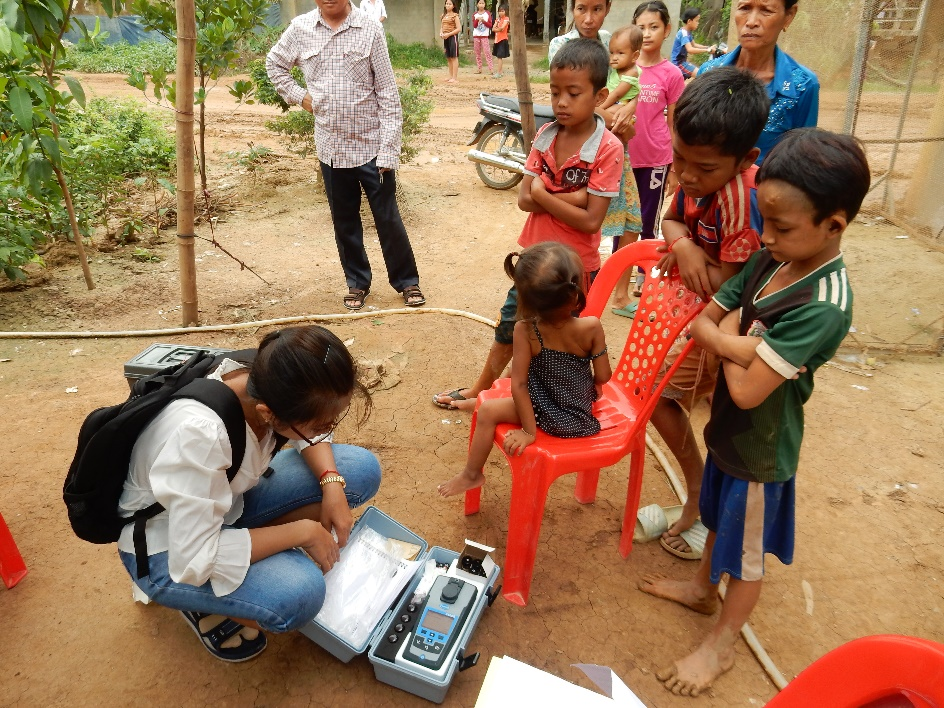 (3) 環境管理における適正技術の確立、水安全計画・衛生安全計画の普及安全な飲料水の供給と基本的な衛生設備へのアクセスは、人権として国際的に認められています。給水および衛生施設の実施を促進するためには、地域の状況-技術的、文化的、社会的および経済的側面を考慮することが不可欠です。社会基盤の実装に必要となる「適正技術」、「水安全計画」や「衛生安全計画」のコンセプトを生かしたプロジェクトの推進に関する研究を進めています。 写真: カンボジア郊外での水質調査 |